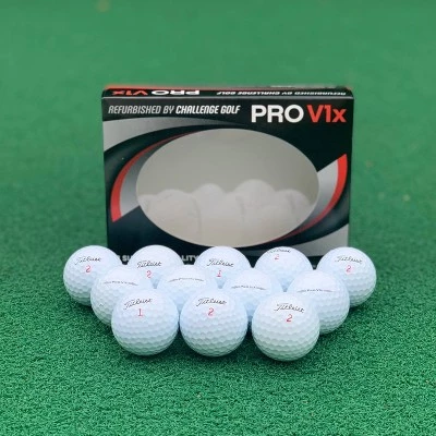 Challenge Golf offers the ProV1x at a fraction of the cost. Play with the #1 ball for players and champions worldwide. The Pro V1x is a four-piece solid core golf ball that is effective for driving long distances while still maintaining a soft feel on the green. These refurbished golf balls by Challenge Golf look and play like new.