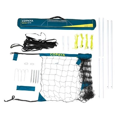 Copaya, featuring beach (playa) influences and Brazilian flavors (Copacabana). Designed for players, by players, our range of balls, sets, nets, and accessories is specially adapted to your beach volleyball needs, no matter your level.. This set contains:- Two adjustable-height posts (3’11” – 5’11” – 8′).- 19’8″-wide net.- 4 tension straps and 4 pegs.- field markers (19’8″ x 39’4″) – 1 carry bag with handle.- 1 assembly guide.