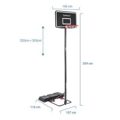 The Tarmak B100 Easy basketball basket is perfect for beginners.It adjusts tool-free to give you 5 different playing heights: 7’3″ for kids aged 8 and up, through to 10′, which is the official height. It means that the hoop evolves with the player’s age or standard. The 2 large wheels make it easy to move.It is perfect for the entire family, stable (46-liter base) and sturdy (metal post). It comes with a 2-year guarantee like all Tarmak backboards from Decathlon.. Dimensions- Base (in): 42.1″ x 17.7″ x 5.9″- Post (in): 2.8″ (diameter) – Backboard (in): 41.7″ x 25.2″ x 1.3″- Hoop diameter (in): 17.7″ (inside) / 19.3″ (outside)- Packaging (in): 46.9″ x 30.7″ x 7.1″Weight- When not weighted (lbs): 81.6- When weighted (lbs): 183- Base volume (liters): 46