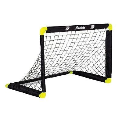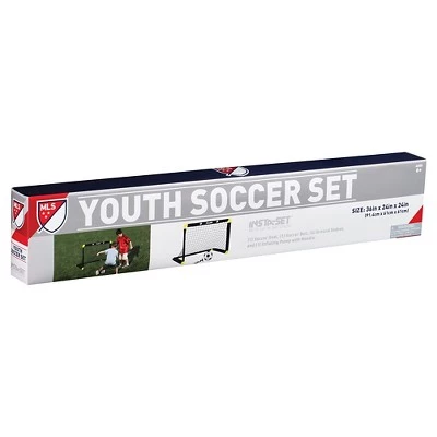 Turn your backyard into a soccer pitch with the Franklin Sports MLS Insta-Set® Soccer Set. The set includes a goal, inflation pump and needle, ground stakes and a soccer ball. This gives you everything you need to start teaching your kids, nieces and nephews soccer fundamentals. The ground stakes help stabilize the goal as kids start dribbling circles around defenders and launching hard shots on net. Recommended for ages 6 and up. No assembly is required. Pick up your MLS Insta-Set soccer set today and practice your skills to get ready for the big game, all while having hours of fun! Dimensions (Overall): 24.0 inches (H) x 36.0 inches (W) x 24.0 inches (D) Color: black, yellow and white