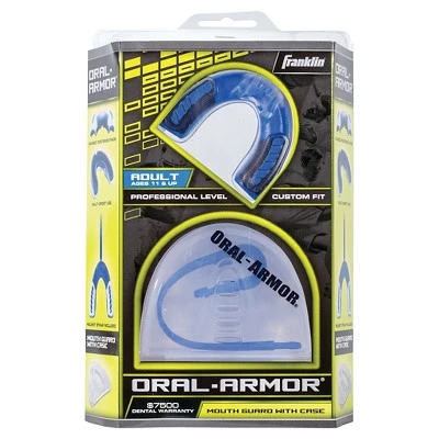 The Franklin Sports Oral-Armor 3D Tri Density Adult Size Mouth guards are the perfect multi-sport design. Each set comes with a detachable strap that supports play with and without a helmet cage. The design features raised multi-density posterior impact pads. The soft gel wall enhanced performance comfort. The fit system functions easily and ensures a customized fit through the boil and bite method. The formula is FDA compliant and BPA Free and provides a unisex fit. This set also includes a $5,000 dental warranty.