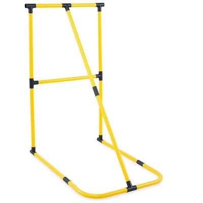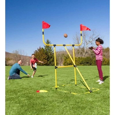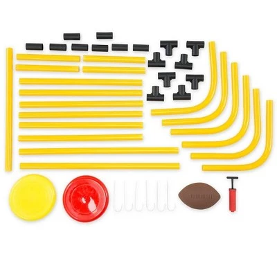 Our Football and Disc Target Kick ‘n Toss Set offers two ways to play! The easy-to-assemble, lightweight plastic framework doubles as a football field goal and a disc toss net. Instructions are included to easily switch the goals back and forth so that kids can engage in fun, active, and challenging play. Hook & loop tape keeps disc net gripped to frame. Alternately, bright red flag pockets slip over vertical pipe sections to mark as a football goal. Take this dynamic play set outdoors or to the park. Play solo or with a group of buddies! Air pump is included for the football. Use the six included ground stakes for stability.