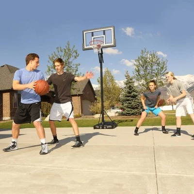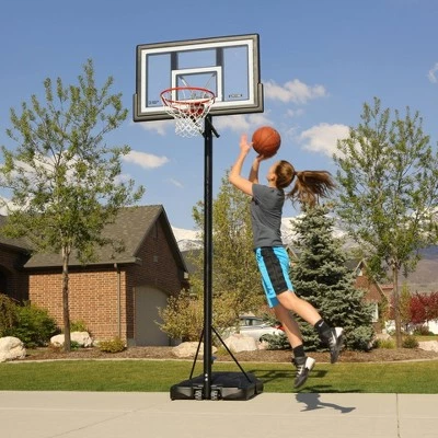 This portable basketball system from Lifetime Products features a 50 in. Shatterproof Fusion™ backboard with a Speed Shift® height adjustment mechanism that adjusts from 8 to 10 feet high in 6-inch increments. It also includes a Slam-It® Rim with an all-weather nylon net and a 3 in. diameter round steel pole. With a 31-gallon portable base, this system can easily be moved to a desired location. So bring the arena to your home with a residential basketball system from Lifetime Products.