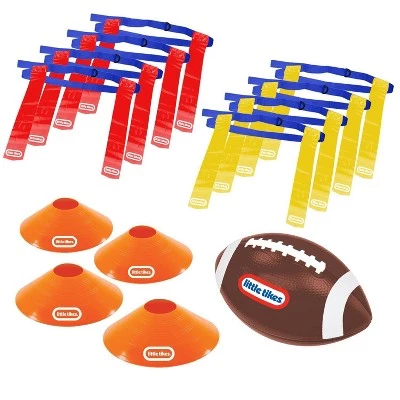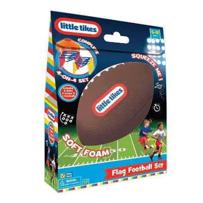 The Little Tikes Flag Football set is a complete 4-on-4 set for the perfect outdoor game to help young players learn the game of football and have non-stop fun at the same time. They easily divide between 2 teams of 4 players with 4 red flags and 4 yellow flags. Instead of tackling, simply pull the runner’s flag to earn your point! Belts are easy to use and flags are easy to put on. Use the 4 orange cones to help with practice runs and set goal targets. 1 soft easy gib football for kids to practice their catch & throws! Perfect for ages 5 and up!