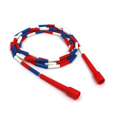 Plastic segments add weight to the rope which makes it easier to develop jump rope skills. Jump rope measures 10 feet long. Our red white and blue jump rope is durable and made of heavy nylon rope covered in unbreakable sections made of plastic. Sold as a pack of 6 jump ropes.