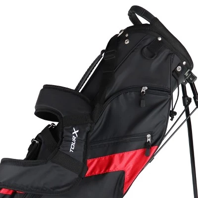 The 3.8lb Tour X SS Stand bag is ultralight weight. It features a 4 way easy grab handle top. It comes with a backpack style, padded dual shoulder strap. It has 4 zippered pockets including a large apparel pocket and a lined valuables pocket. This bag is ready to carry your full set of clubs. It is offered in 3 color options. Black/Black, Black/Charcoal and Black/Red. This bag is great or walking, throwing on a cart and would be a great bag to travel with since it is so light weight.