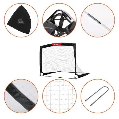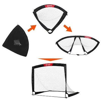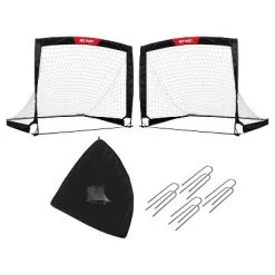 You can help your children to improve their soccer skills with the fold-up training goal. The goals come in pairs, Set of 2. Each goal sets up and folds up easily with a quick twist. It also includes a carrying bag for easy transport. Assembled size(lxhxd): 4′ x 3′ x 3′. It required first time assembly. Squared structure and unique collapsible design can be easy quick set up and break down. Durable fiberglass frame construction supports training on all levels. Lightweight and portable is for training anywhere. All weather net. 8 ground pegs included.