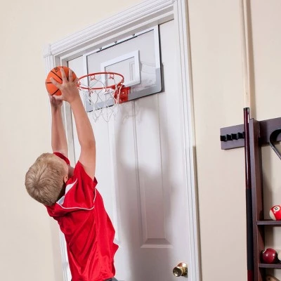 Bring the arena to your doorway. This over-the-door unit lets you sink shots from your office chair or living room couch. A quarter-scale replica of the official on-court backboard, it has a clear, durable board and steel breakaway 180 rim and includes two basketballs, for double the fun.
