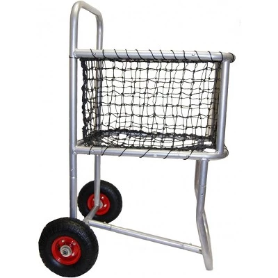HD powder coated steel frame with premium mesh netted basket. Pneumatic turf tires protect playing surface. Holds 300 baseballs.