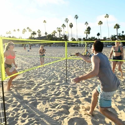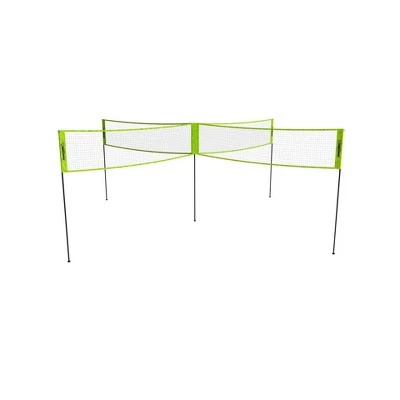 Try something new with the Triumph 4 Square Volleyball Badminton Combo Set. This four-way net is innovative, fun, and totally unique – raising to regulation volleyball net height and lowering to regulation badminton height in just a few easy steps. With convenient spring clips, you’ll be set up and playing in no time. The perfect addition to sunny days, this set ideal for sandy beaches and grassy yards alike – anywhere with a nice, soft surface to set up. This set includes one volleyball, four badminton rackets, three shuttlecocks, air pump with needle, net and metal frame, boundary rope, guide ropes, and carry bag.